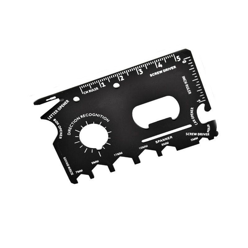 Format carte de crédit, idéal pour se glisser dans un portefeuille, une poche, etc. 16 fonctions : règle en pouces, règle en cm, décapsuleur, ouvre-boîte, 4 tournevis plats, 6 clés Allen, coupe-papier et indicateur de direction. Idéal pour le vélo, le camping, la randonnée et bien plus encore.