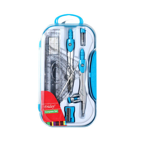Coffret de géométrie 10 pièces, idéal pour les mathématiques. Boîte en plastique contenant 2 compas autocentrants, un crayon, des mines de rechange, une règle de 15 cm, un rapporteur, 2 équerres, une gomme et un taille-crayon. La règle, le rapporteur et les équerres transparents permettent de bien visualiser le travail. Boîte en plastique transparente aux touches de couleur. Le tout est rangé dans une boîte en plastique facile à transporter.