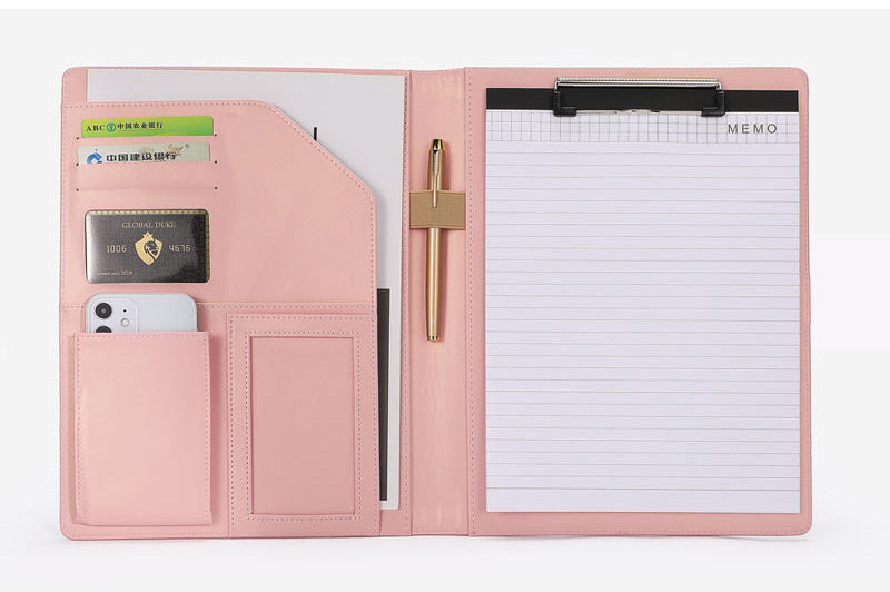 Soyez organisé et préparé avec cet élégant porte-documents A4 en cuir. Conçu pour les professionnels, il est doté de plusieurs emplacements pour cartes, d'une poche pour téléphone, d'un porte-stylo et d'un presse-papiers en métal. Il est fourni avec un bloc-notes A4 pour faciliter la prise de notes lors de réunions, d'entretiens ou de missions sur le terrain. Fabriqué en cuir PU résistant, ce porte-documents élégant et portable garde vos documents et vos essentiels bien en place, où que vous soyez.